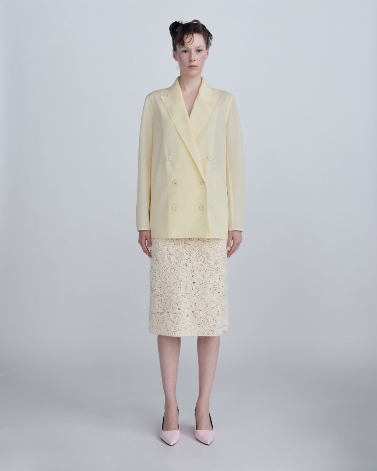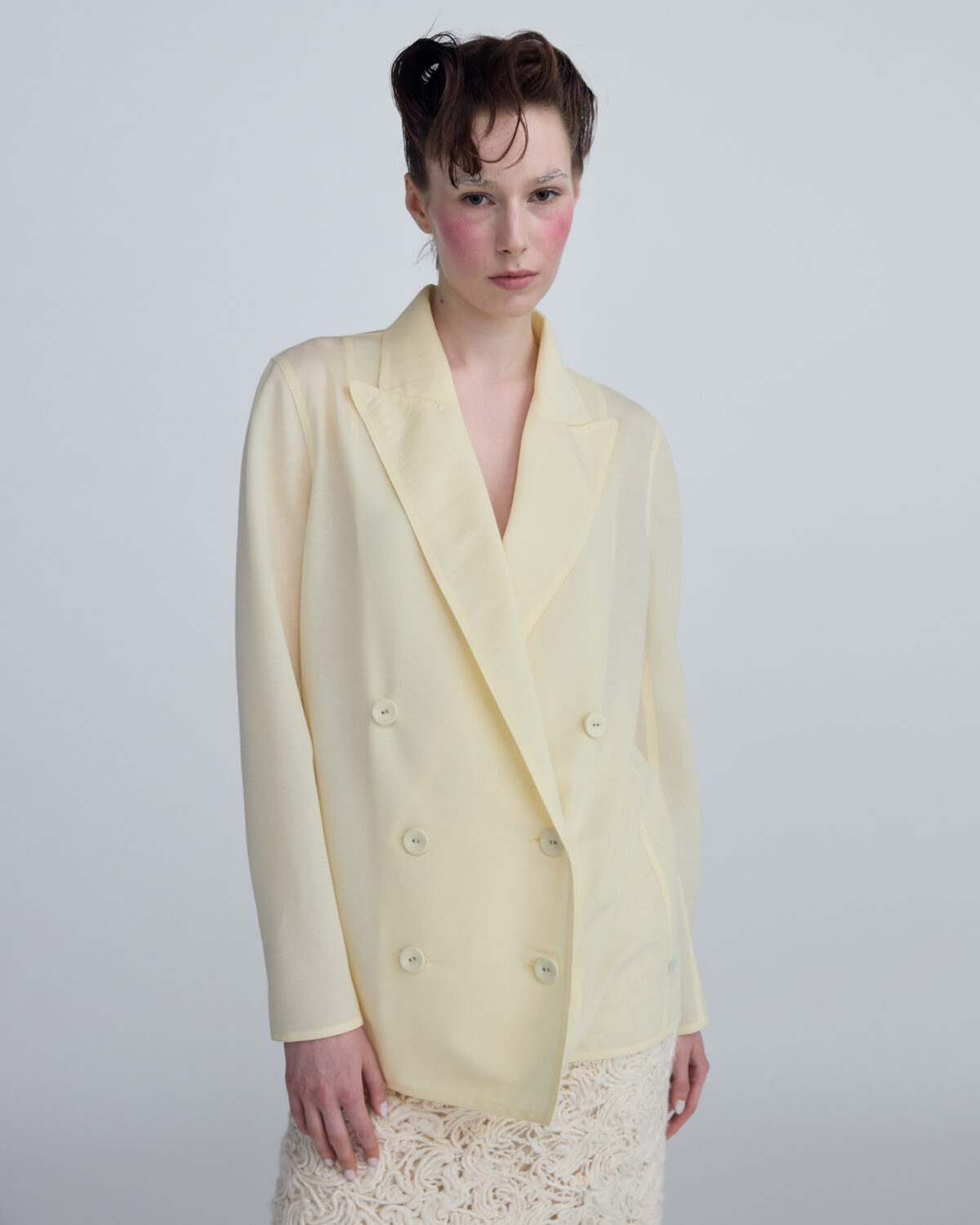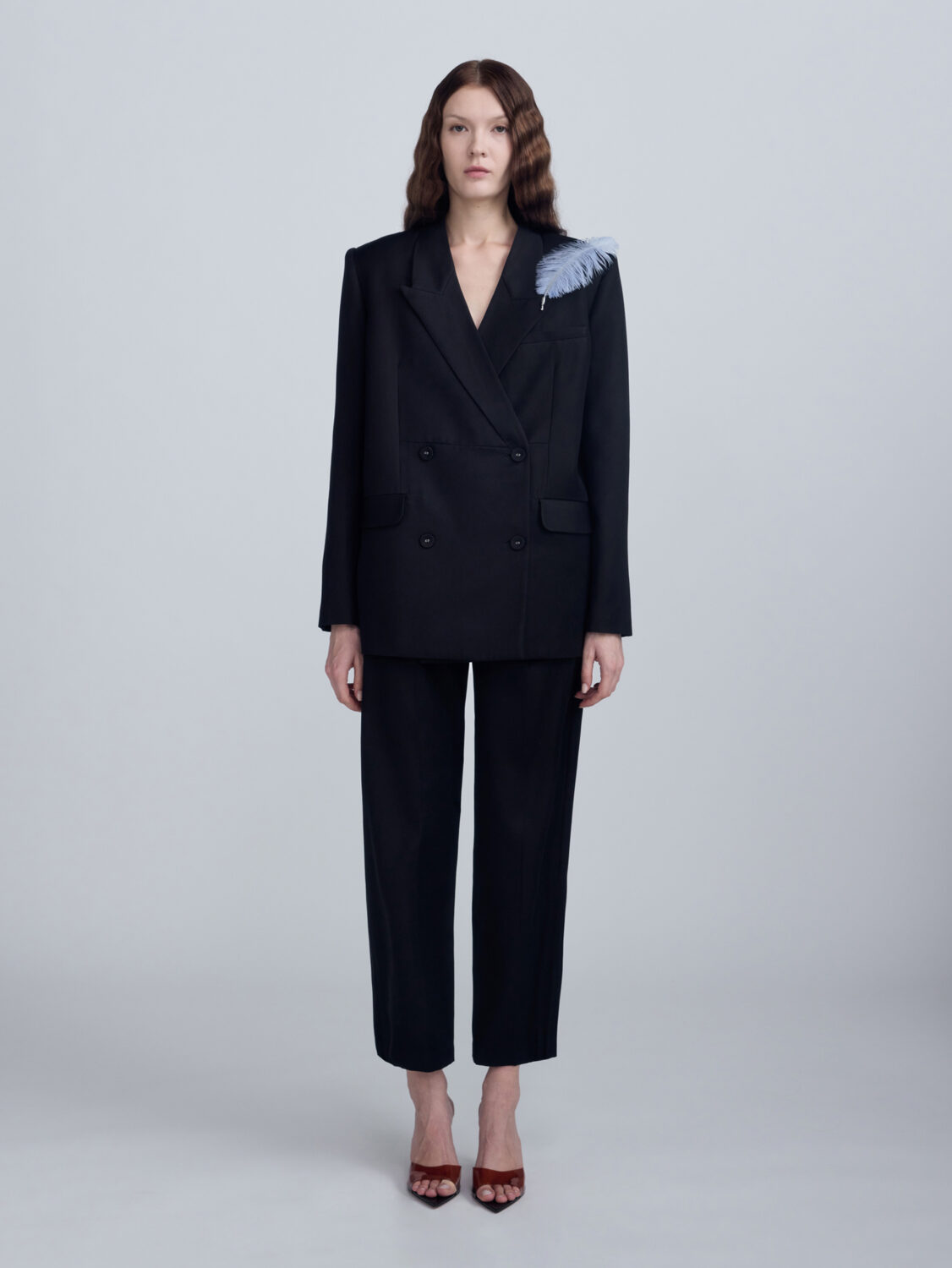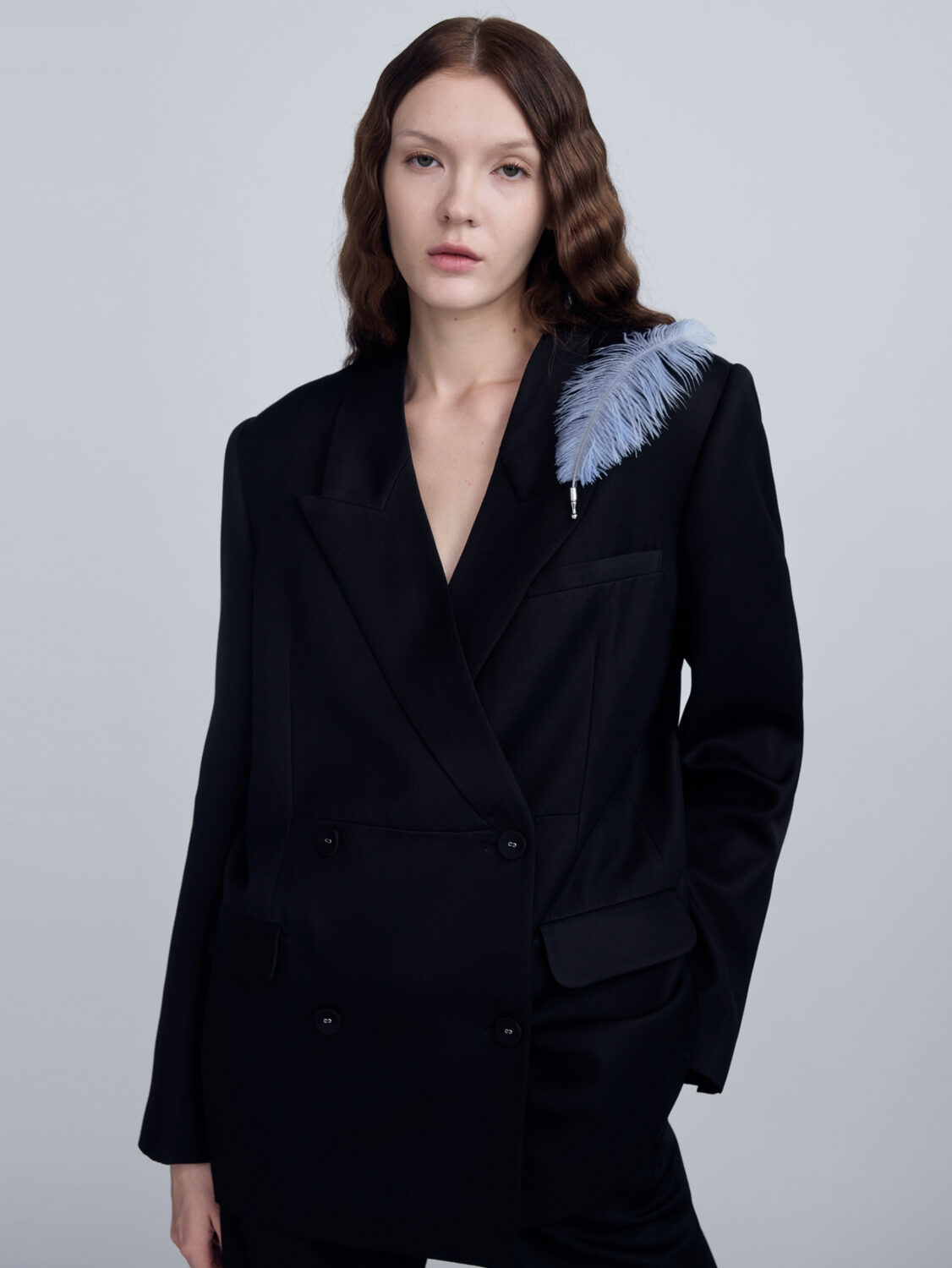 NEWSALEVICKTEERUT Double-Breasted Peak-Lapel Blazer with Detachable Ostrch Feather Pin เบลเซอร์ กระดุมสองแถว พร้อมเข็มกลัดขนนกกระจอกเทศ