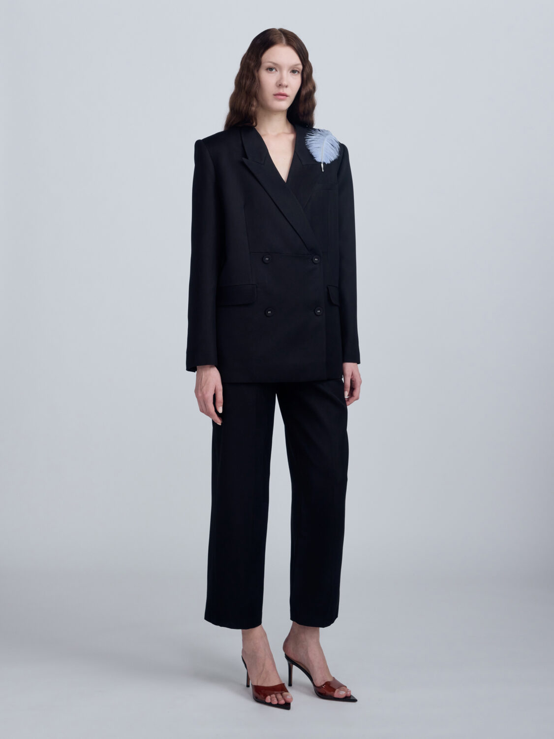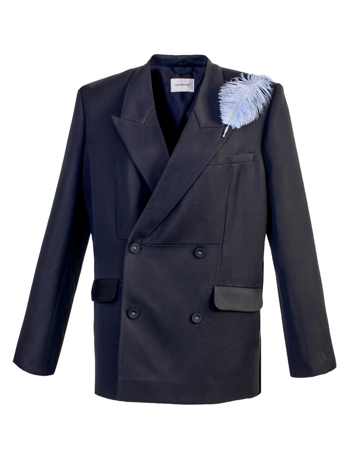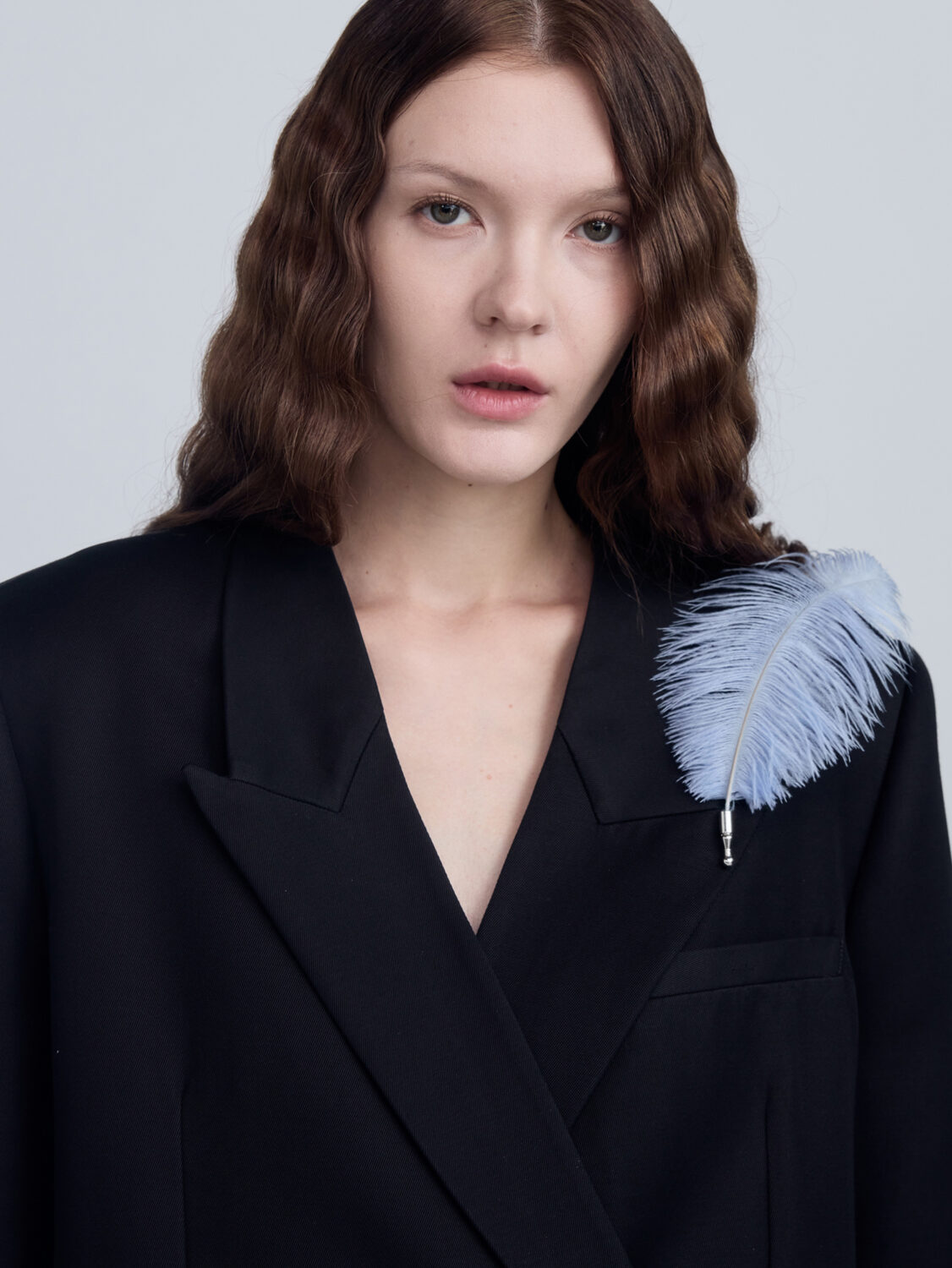 VICKTEERUT Double-Breasted Peak-Lapel Blazer with Detachable Ostrch Feather Pin เบลเซอร์ กระดุมสองแถว พร้อมเข็มกลัดขนนกกระจอกเทศ