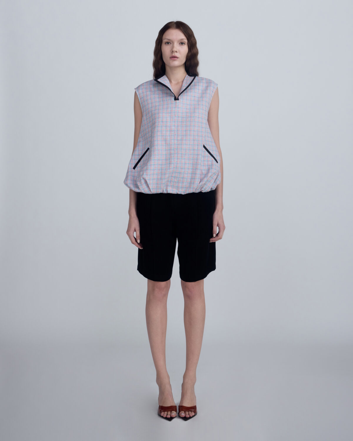 VICKTEERUT Linen Stripe Sleeveless Blouse with Contrast Piping Detail