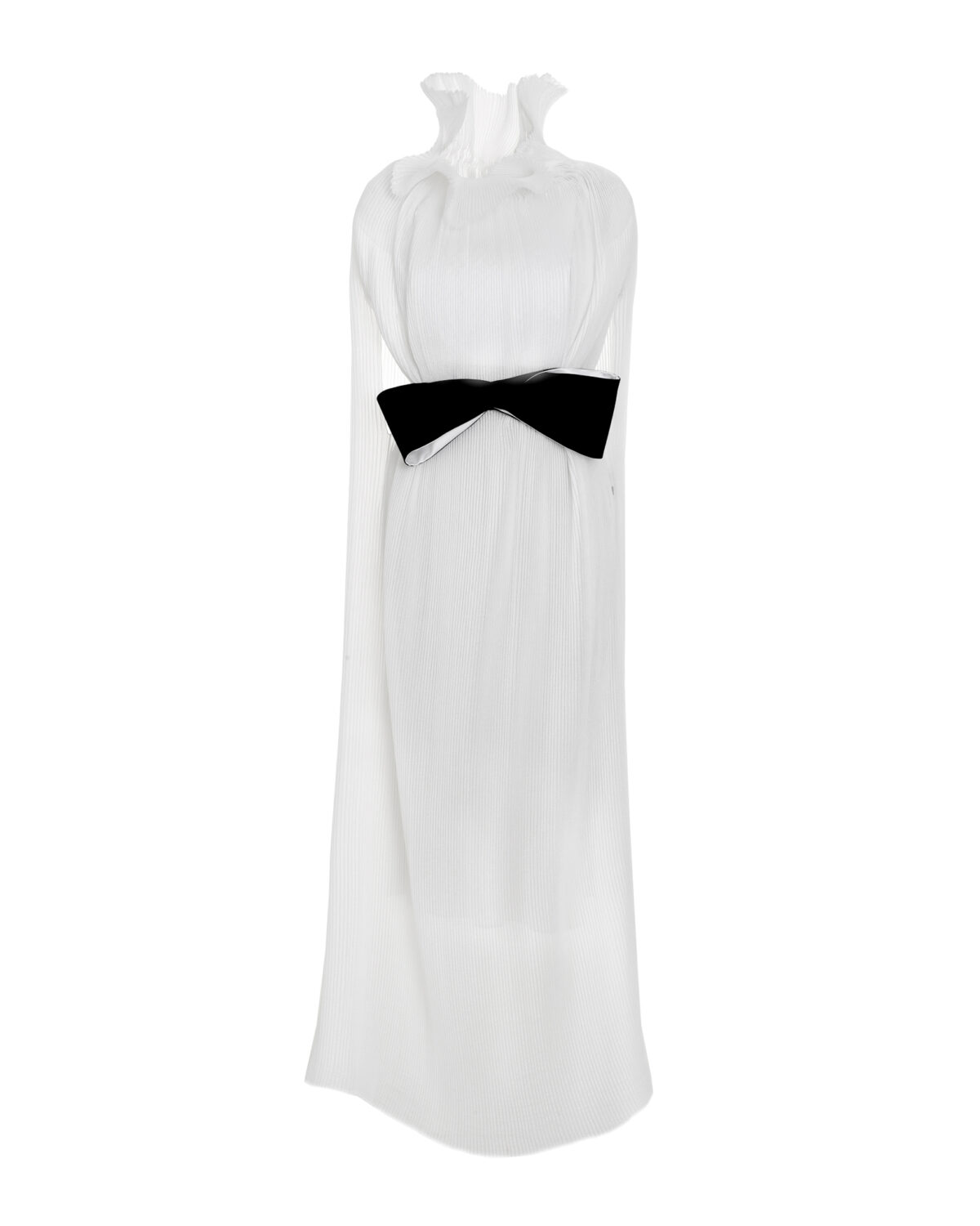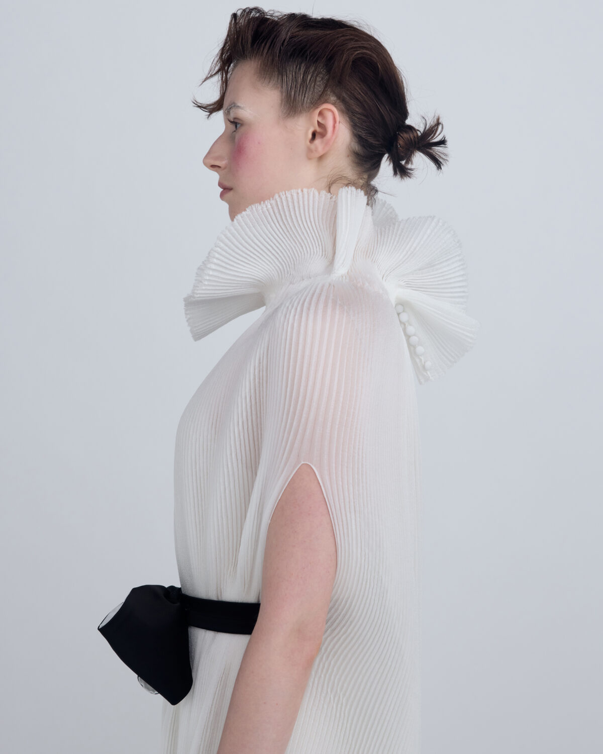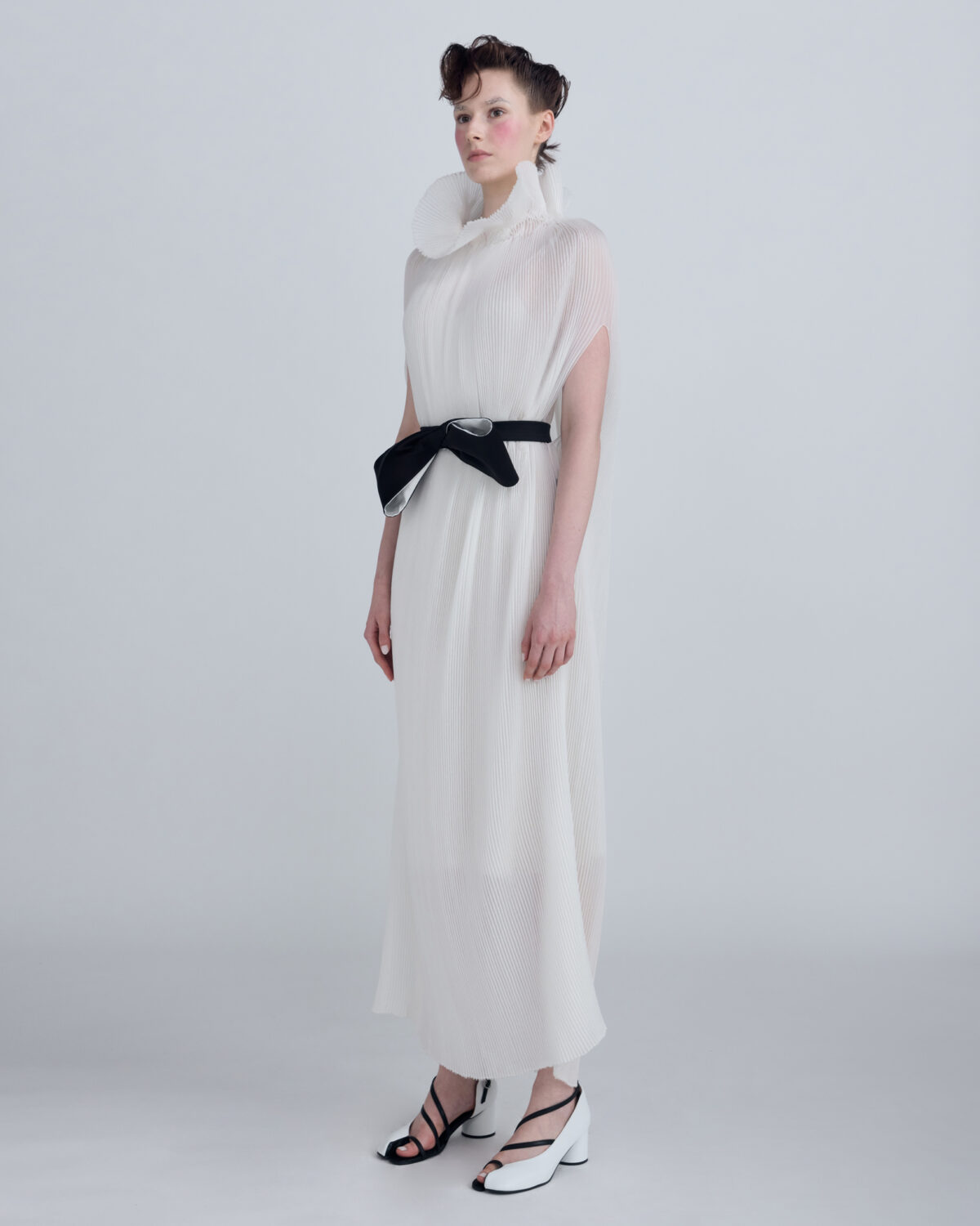 VICKTEERUT Sleeveless Ruffle Neck Pleated Dress with Bow Belt เดรสแขนกุด อัพพลีท คอระบาย ตกแต่งเข็มขัดโบว์